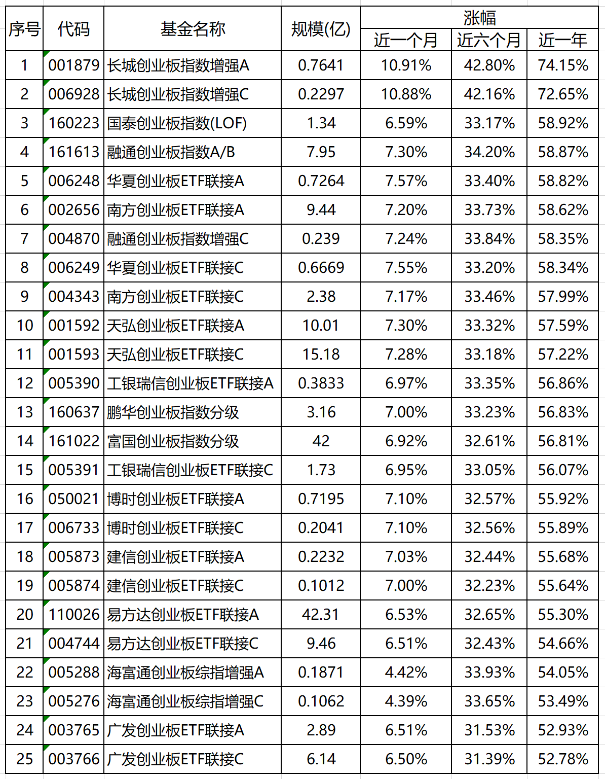 除了长城创业板指数增强A/C外,其他基金的上涨幅居相差不是太大。对于指数型基金来说,规模越大,所投资金越安全。规模上,至少超过2亿,那么,筛选出如下11只基金: