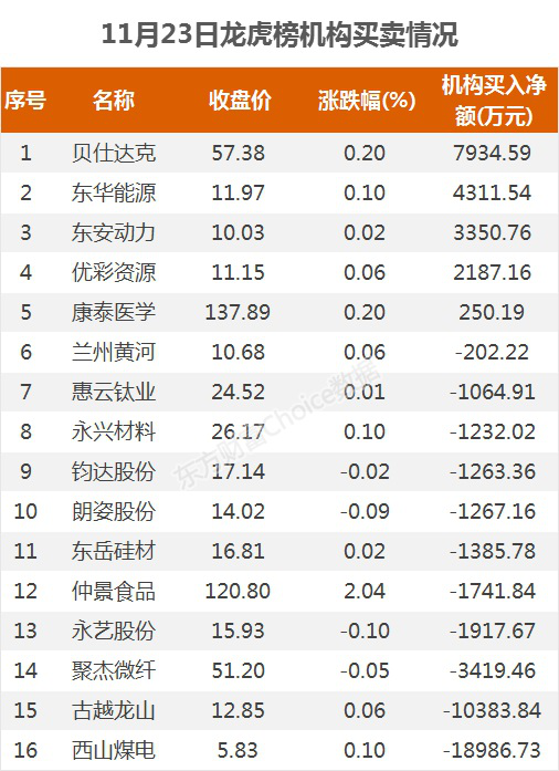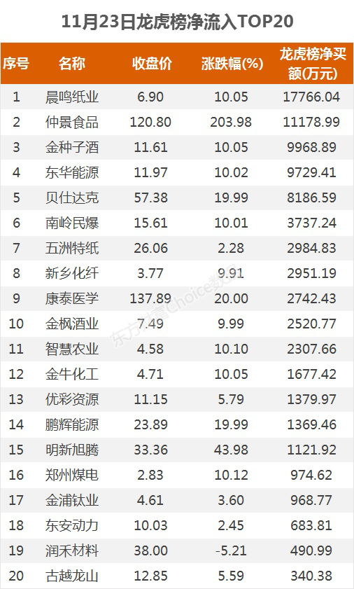 摘要【龙虎榜:1.8亿资金抢筹晨鸣纸业 机构净买这5股】11月23日,指数整体震荡走高,尾盘有所回落,截至收盘,沪指涨1.09%,报收3414点;深成指涨0.74%,报收13955点;创业板指涨0.72%,报收2686点。盘面上,煤炭、染料、白酒等板块涨幅居前,旅游酒店、机场航运、医美等板块跌幅居前。
