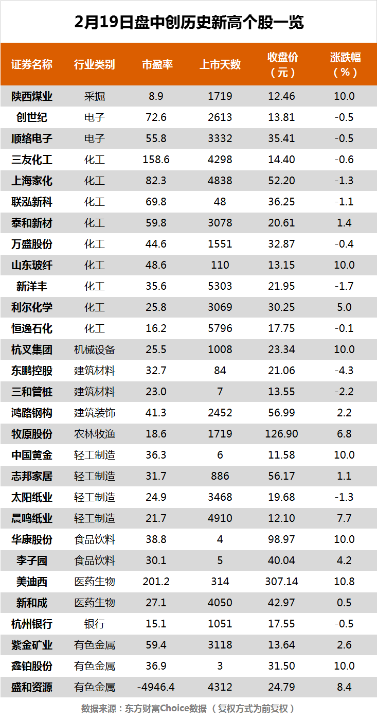 摘要【指数全天探底回升 牧原股份、陕西煤业等29股创历史新高】2月19日,沪指收报3696.17点,涨0.57%;深证成指收报15823.11点,涨0.35%;创业板指收报3285.53点,跌1.04%。东方财富Choice数据显示,今日有29只个股盘中股价创历史新高,包括牧原股份、陕西煤业等。