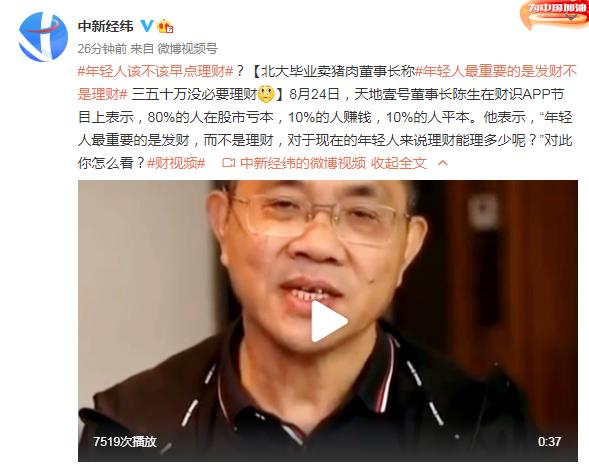 摘要【北大毕业卖猪肉董事长:年轻人最重要是发财不是理财 三五十万没必要理财】8月24日,天地壹号董事长陈生在财识节目上表示,80%的人在股市亏本,10%的人赚钱,10%的人平本。他表示,“年轻人最重要的是发财,而不是理财,对于现在的年轻人来说理财能理多少呢?”对此你怎么看?(中新经纬)