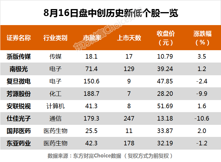 摘要【创业板指跌1.31% 富瀚微、九鼎新材等37股创历史新高】8月16日,沪指收报3517.34点,涨0.03%;深证成指收报14693.74点,跌0.71%;创业板指收报3301.39点,跌1.31%。东方财富Choice数据显示,今日有37只个股盘中股价创历史新高,包括富瀚微、九鼎新材等。
