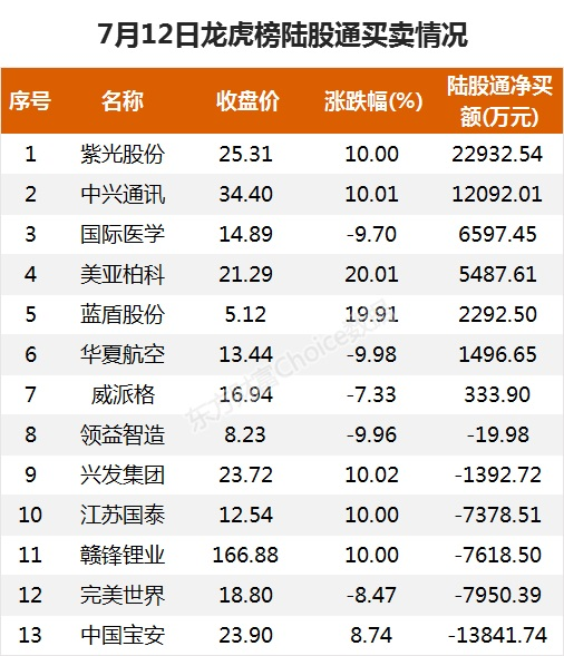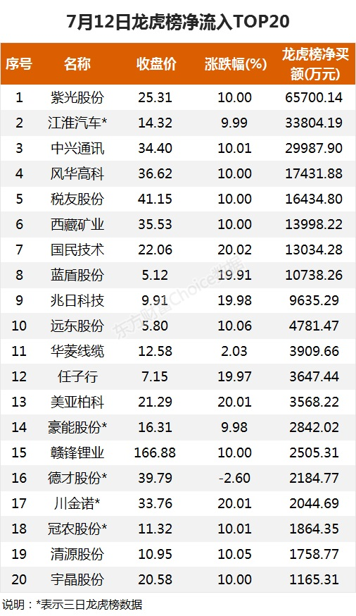 龙虎榜净流入TOP207月12日,上榜龙虎榜个股中,资金净流入最多的是紫光股份,为6.57亿元。数据显示,该股日内涨停收盘,全天换手率4.35%。具体看,深股通净买入2.29亿元。