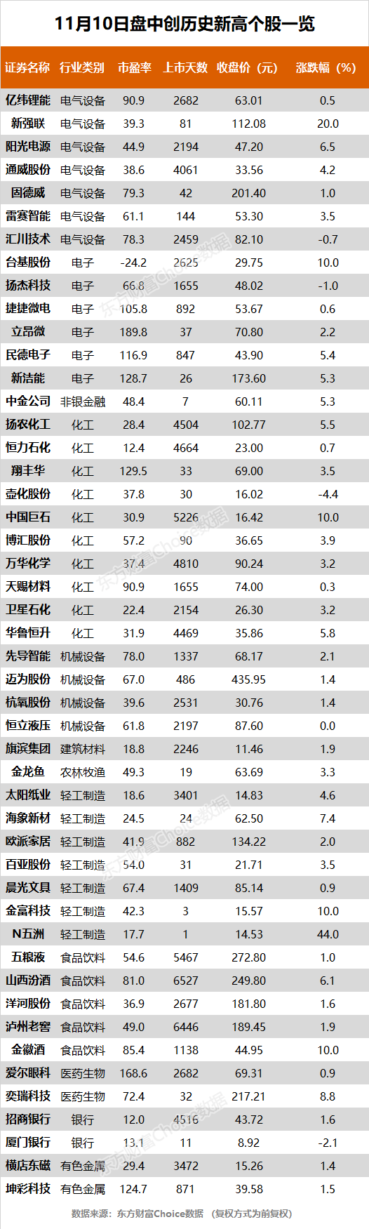 今世缘(54.4 9.83%)山西汾酒(249.8 6.08%)古井贡酒(235.95 4.82%)白酒(2.94%)酿酒行业(1.61%)甘肃板块(-0.63%)11月10日,沪指收报3360.15点,跌0.40%。东方财富Choice数据显示,今日有48只个股盘中股价创历史新高。其中,个股包括金徽酒、中国巨石等。