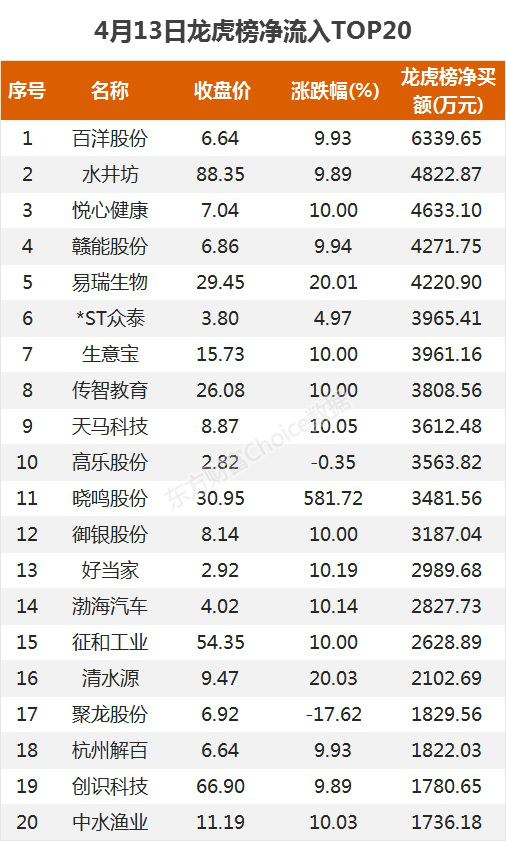 龙虎榜净流入TOP204月13日,上榜龙虎榜个股中,资金净流入最多的是百洋股份,为6339.65万元。数据显示,该股日内涨停收盘,近三日累计涨幅21.39%。数据显示,华鑫上海分公司净买入3092.47万元。