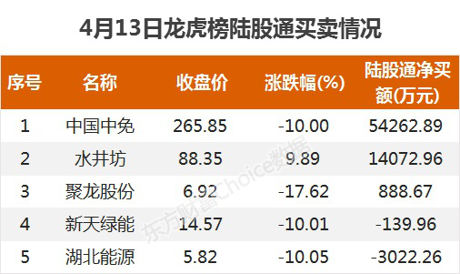 数据来源:东方财富Choice数据陆股通买卖情况陆股通参与龙虎榜中个股共涉及5只个股,其中3股被陆股通净买入,中国中免被买入最多,为5.43亿元。另外两股被陆股通净卖出,湖北能源被卖出最多,为3022.26万元。