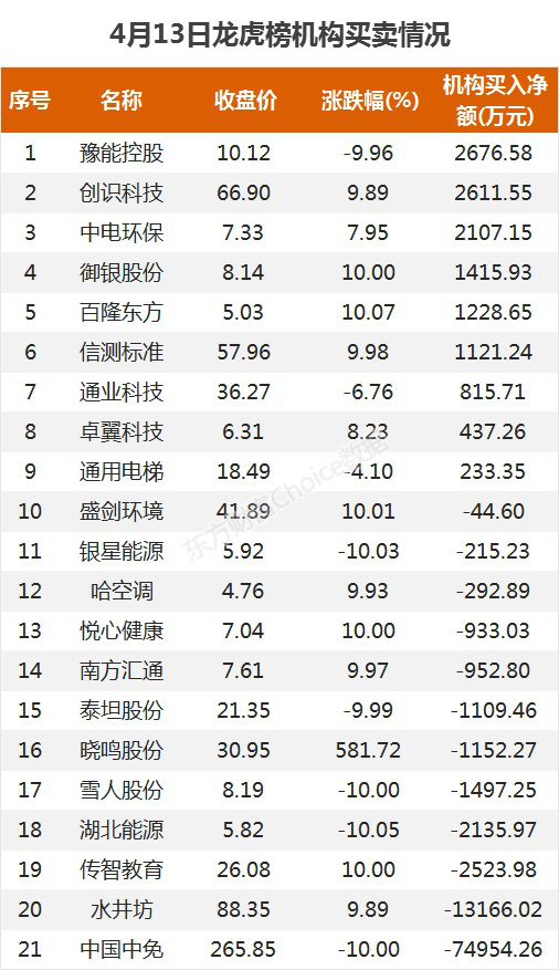 数据来源:东方财富Choice数据机构买卖情况机构参与龙虎榜中个股共涉及21股,其中9股被机构净买入,豫能控股被买入最多,为2676.58万元。另外12股被机构净卖出,中国中免被卖出最多,为7.5亿元。