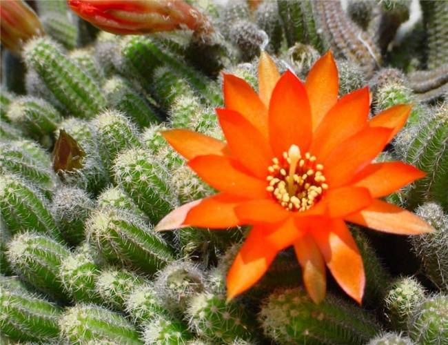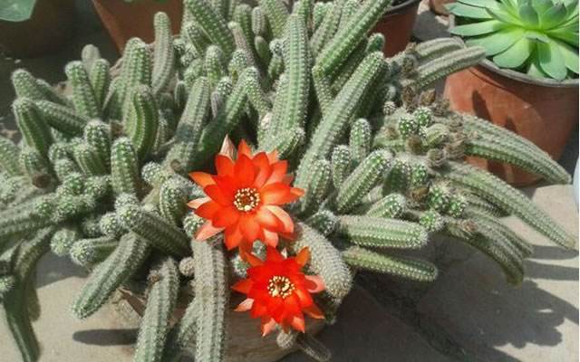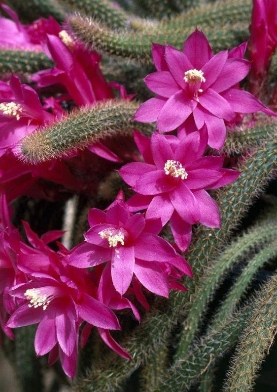花:鼠尾掌的花期4—5月,花漏斗状,粉红色,长约8厘米,径长7厘米,花被片急尖,昼开夜闭,可持续一周。浆果球形,红色,有刺毛,种子小,红褐色。
