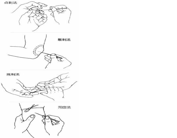 1)直接点刺法。先在针刺部位揉捏推按,使局部充血,然后右手持针,以拇、食二指捏住针柄,中指端紧靠针身下端,留出针尖0.1~0.2寸,对准已消毒过的部位迅速刺入。刺入后立即出针,轻轻挤压针孔周围,使出血数滴,然后以消毒棉球按压针孔即可。此法适于末梢部位。如十二井穴,十宣穴及耳尖穴等刺血。