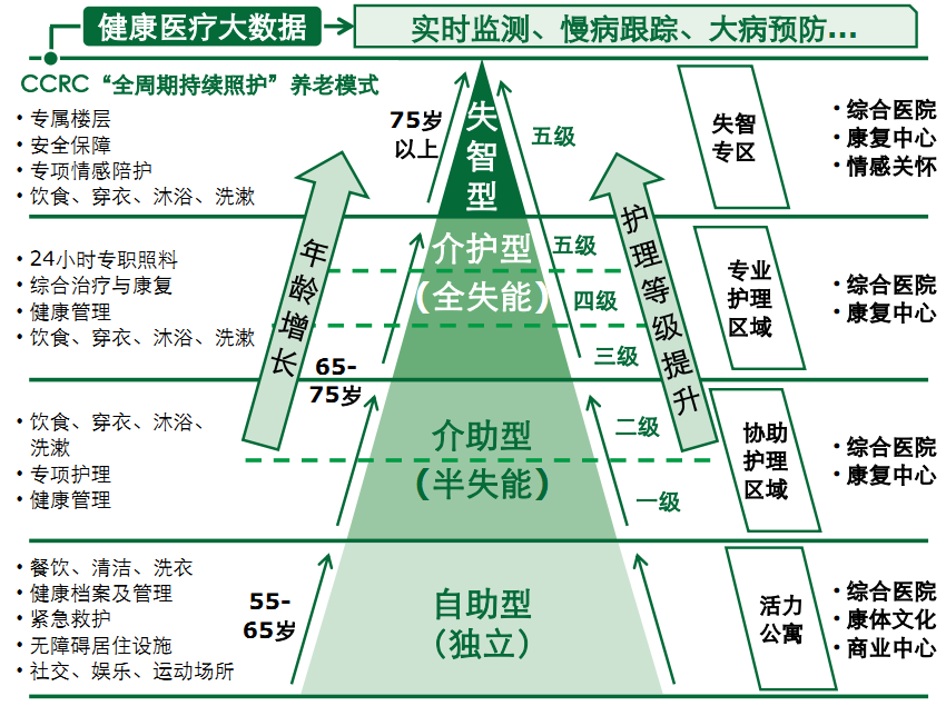 健康养老社区——参考CCRC“全周期持续照护”模式,建设“数据护驾,医养结合”健康养老社区。
