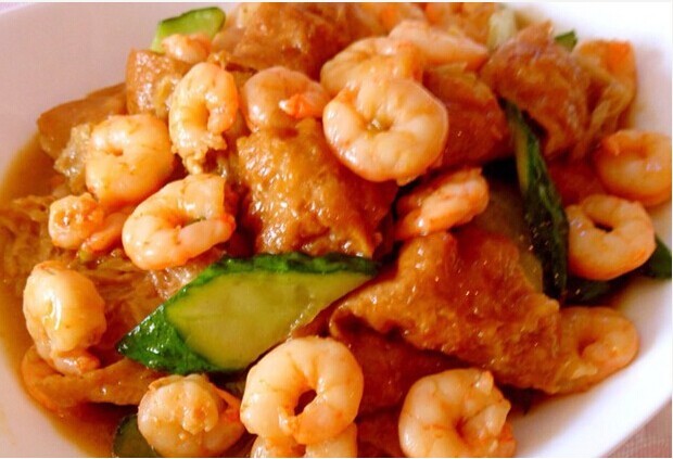 把黄瓜短暂过油捞出~留少许底油~油热后爆香大料~葱姜末~烹入料酒~蚝油~生抽~适量清水~水开后放入面筋~煮到微微膨胀~放入虾仁~盐~糖~胡椒~轻轻翻炒~最后放入黄瓜~勾芡~香油提味出锅~