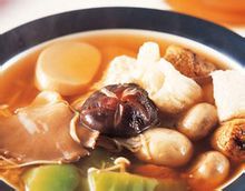 6.再下入面筋块,待面筋烧透,再下入鲜笋片、香菇丝和青菜段,以湿淀粉勾芡即成。