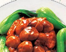 辅料:干淀粉2茶匙(30克)、老抽、生抽各1汤匙(50ML)、白砂糖1汤匙(15克)、大葱花、姜末、盐各1茶匙(5克)、油菜心、香菇各100克、冬笋50克、 蚝油1汤匙(15ML)、清水300ML、黄酒、油各12茶匙(15ML)。