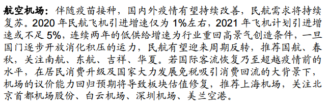 国信证券提到,伴随疫苗接种,国内外疫情有望持续改善,民航需求将持续复苏。2020年民航飞机引进增速仅为1%左右, 2021 年飞机计划引进增速或不足 5%,连续两年的低供给增速为行业重回高景气创造条件,一旦国门逐步开放消化积压的运力,民航有望迎来周期反转。若国际客流恢复乃至超越疫情前的水平,在居民消费升级及国家大力发展免税吸引消费回流的大背景下,机场的议价能力回归预期将导致板块估值修复。