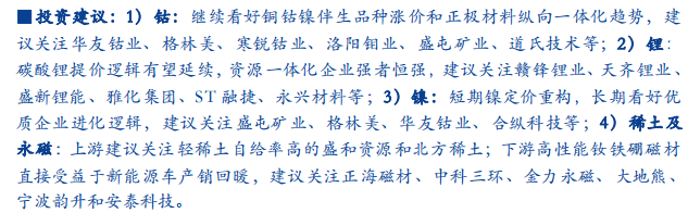 安信证券给出投资建议:1)钴:继续看好铜钴镍伴生品种涨价和正极材料纵向一体化趋势;2)锂:碳酸锂提价逻辑有望延续,资源一体化企业强者恒强;3)镍:短期镍定价重构,长期看好优质企业进化逻辑;4)稀土及永磁:上游建议关注轻稀土自给率高的盛和资源和北方稀土;下游高性能钕铁硼磁材直接受益于新能源车产销回暖。
