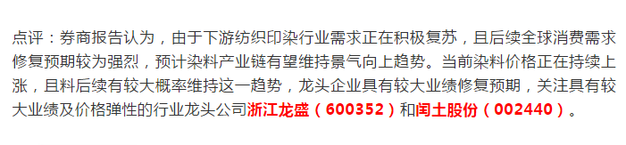 国金证券此前表示,春节后过后活性染料需求旺季随之而来,今年大部分印染企业开工比往年要早,有的印染企业已经开始生产春节前来不及生产的订单。在原料成本大幅上涨背景下,活性染料及中间体企业生产经营压力大,通过旺季涨价提高企业利润是企业必然选择,多年来春节后涨价也是染料市场规律。此外,环保安全趋紧提高了染料生产企业准入门槛,小型染料生产企业的环保安全方面的成本优势荡然无存,限制了活性染料的整体供给。在原料成本上涨、需求驱动,以及分散染料涨价等多种因素影响下,活性染料开启上涨通道。