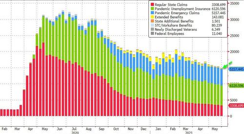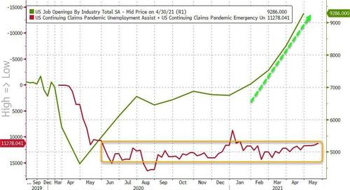 Finally, we note that the number of Americans on some form of pandemic unemployment aid remains relatively flat (same levels as for the last year) while job openings are exploding higher...
