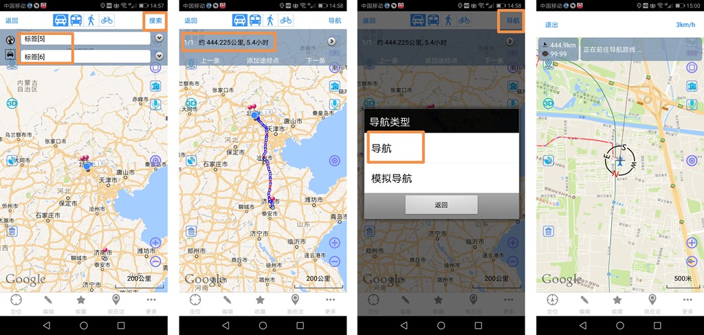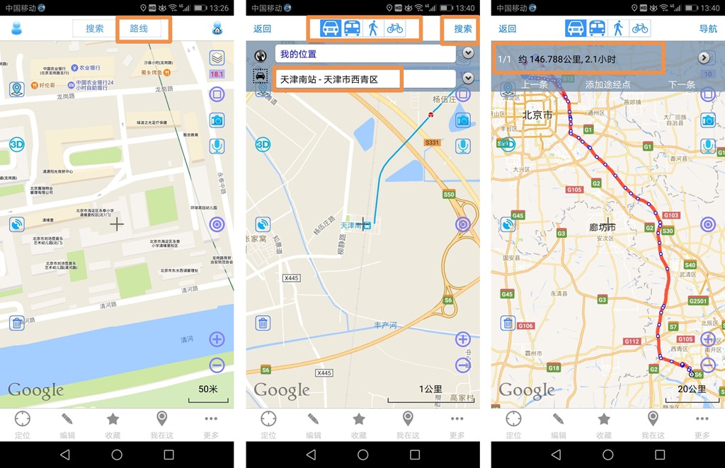 添加途径点、市内公交路线导航、保存路线请参考上文说明。