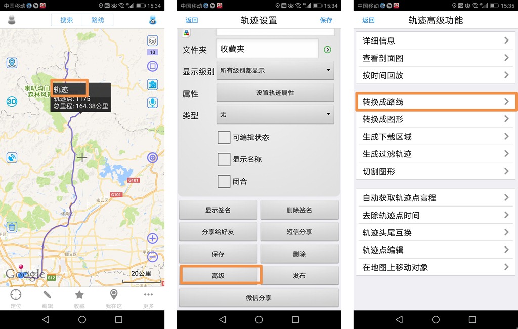 在地图上,点击轨迹,点击下图所示位置,进入【轨迹设置】页面,点击【高级】,点击【转换成路线】按钮,即以将轨迹转换成了路线。