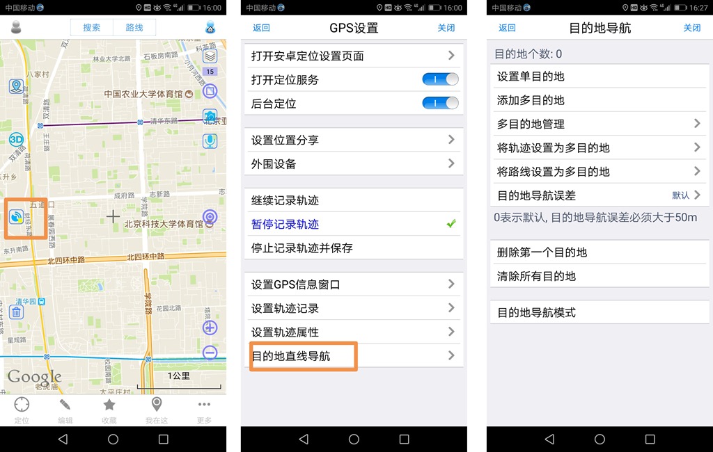 添加多目的地,可选择标记作为目的地,可以经纬度位置为目的地,可在地图上直接选择目的地。添加完目的地后,即可执行导航,请参考步骤(5)。