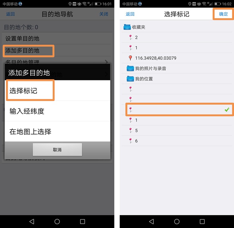 ①选择标记:点击【添加多目的地】,点击【选择标记】,选中需要作为目的地的标记,点击【确定】按钮,即可将该标签添加为目的地。若要添加多个,则重复执行该操作。