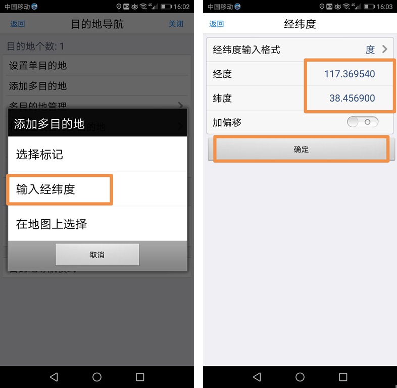 ②输入经纬度:点击【添加多目的地】,点击【输入经纬度】按钮,进入【经纬度】窗口,输入经纬度,点击【确定】按钮,即可。若要添加多个,则重复执行该操作。