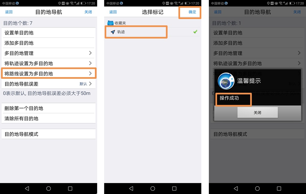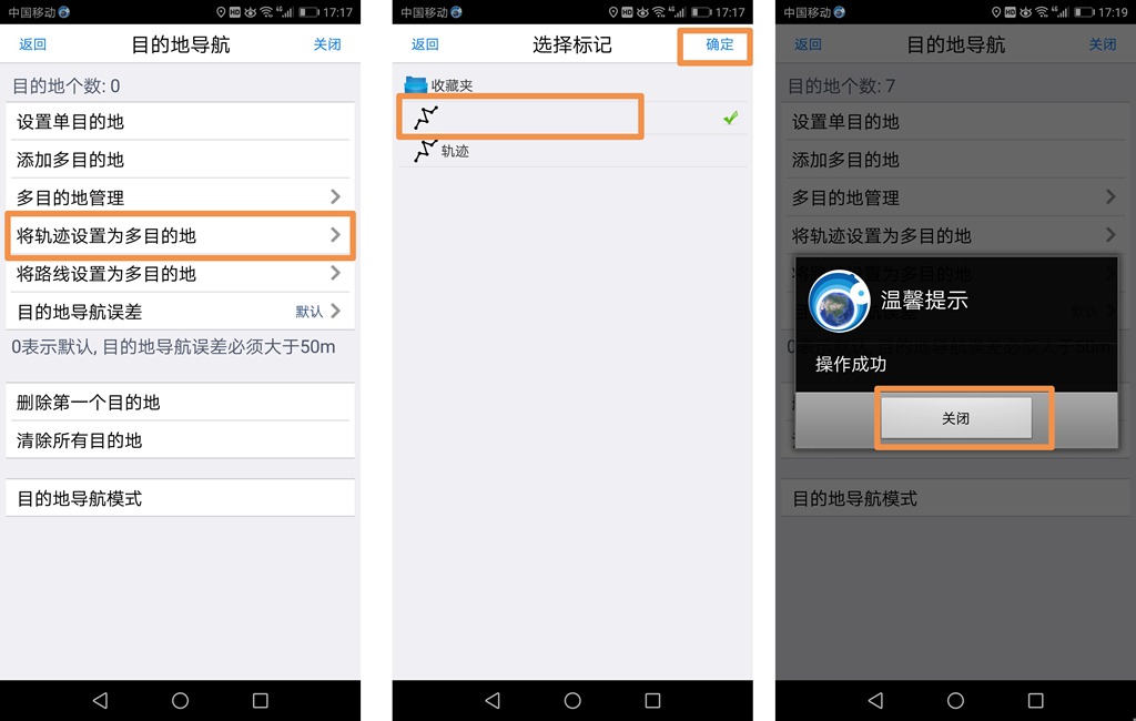因轨迹上存在轨迹点,所以可直接将轨迹点设置为多目的地。在【目的地导航】页面中,点击【将轨迹设置为多目的地】按钮,进入【选择标记】窗口,选择轨迹,点击【确定】按钮,即可。执行导航,请参考步骤(5)。