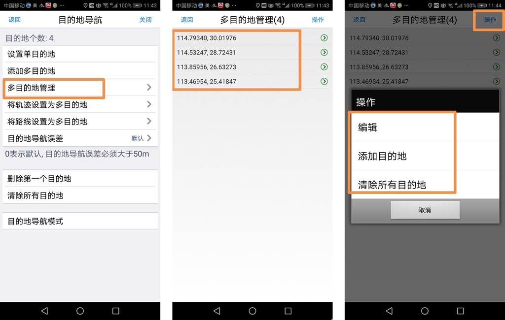 在【目的地导航】窗口中,点击【多目的地管理】按钮,进入【多目的地管理】页面,点击【操作】按钮,可编辑、添加、清除目的地。