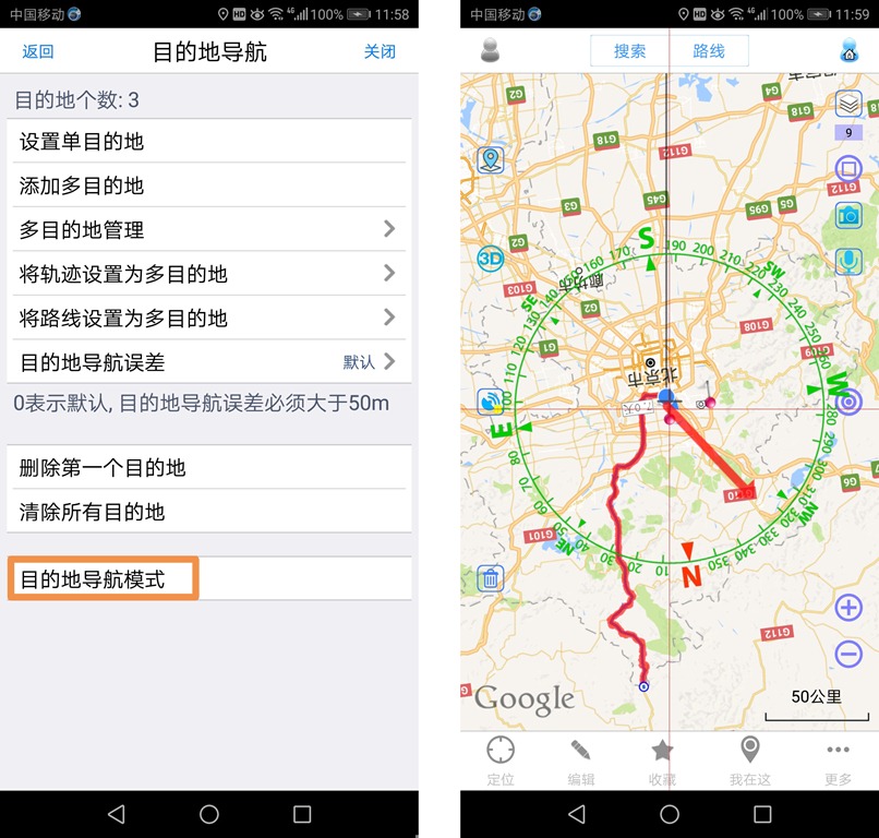 添加完目的地后,点击【目的地导航模式】按钮,即可开始导航。