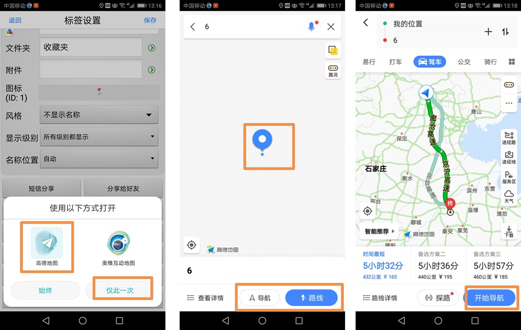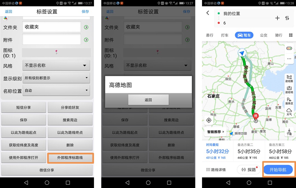 在【标签设置】页面中,点击【使用外部程序打开】,选择外部程序(如高德),点击【仅此一次】,系统自动启动高德程序并定位出该点的位置,若点击【导航】按钮,高德以默认的交通方式、路线开始导航;若点击【路线】按钮,则会显示路线,用户可修改起点、交通方式、路线等,点击【开始导航】按钮,即可。