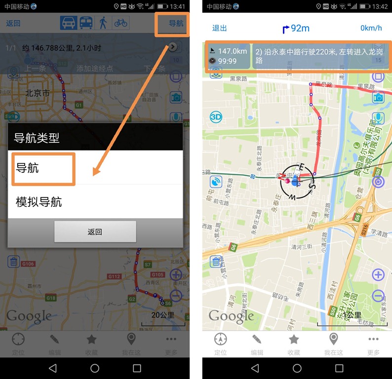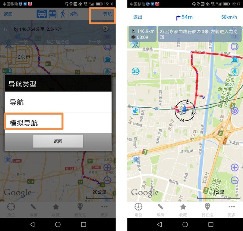在导航之前,用户可进行模拟导航。点击【导航】按钮,点击【模拟导航】,即可开始模拟导航,在模拟导航的过程中,会有相关语音提示。