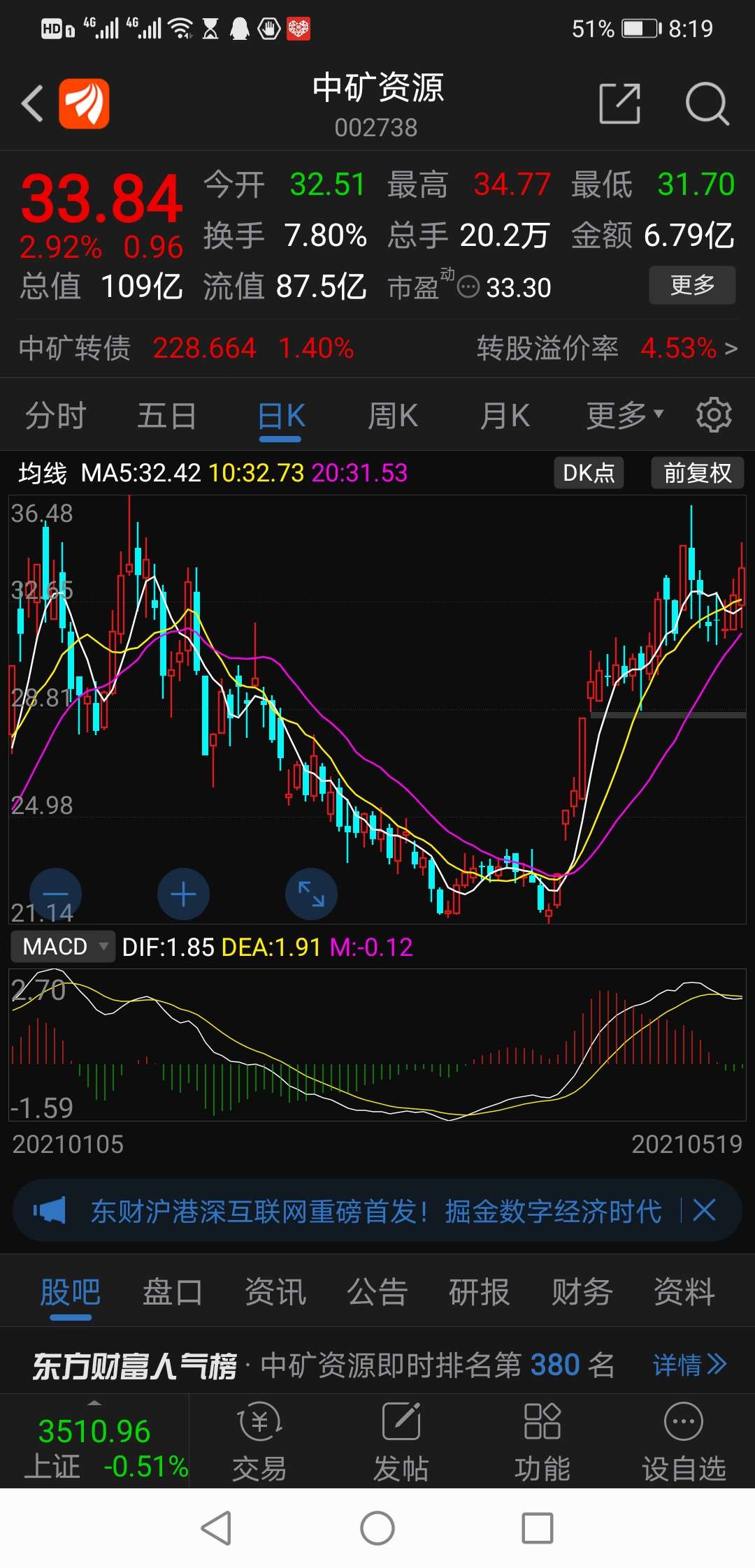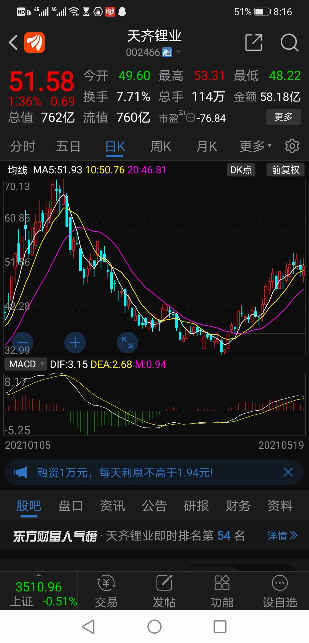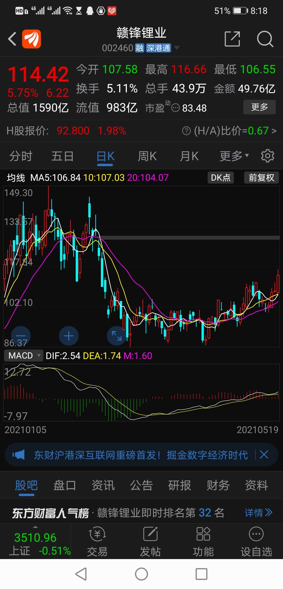 特斯拉订单暴增,比亚迪刀片电池车供不应求,要排队几个月才能提车。燃油汽车正在加速淘汰之时,首先加速紧缺的一定是锂资源。现在全世界都在争抢锂矿资源,好在天齐锂业将卫平董事长未雨绸缪,早早布局了国现在全世界都在争抢锂矿资源,由此判断天齐锂业的上涨70.13后回调到32.99已经基本到位,主升第三大浪从32.99到目标159正在孕育中。