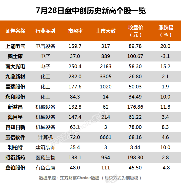 摘要【创业板指涨1.61% 上能电气、九鼎新材等13股创历史新高】7月28日,沪指收报3361.59点,跌0.58%;深证成指收报14086.42点,跌0.05%;创业板指收报3284.92点,涨1.61%。东方财富Choice数据显示,今日有13只个股盘中股价创历史新高,包括上能电气、九鼎新材等。