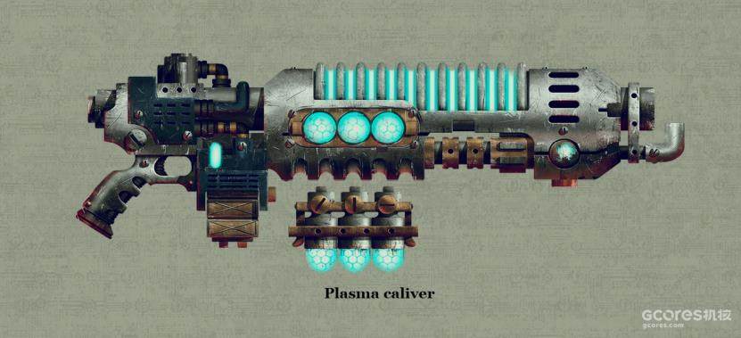 机械教的武器往往看上去都古色古香,但都是宗教体系的外表,其内部往往都是极其复杂与先进的。护教军们的武器就是典型的例子,他们的武器能够发射各种机械教的先进实体弹药系统,但也能使用刚刚发现的强大能量模式,转变成能量武器的发射模式;本图就是一个例子。