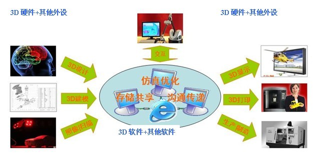 3D技术是推进工业化与信息化"两化"融合的发动机,是促进产业升级和自主创新的推动力,是工业界与文化创意产业广泛应用的基础性、战略性工具技术,嵌入到了现代工业与文化创意产业的整个流程,包括工业设计、工程设计、模具设计、数控编程、仿真分析、虚拟现实、展览展示、影视动漫、地产宣传片、3D立体画、电子楼书、教育训练等,是各国争夺行业至高点的竞争焦点。