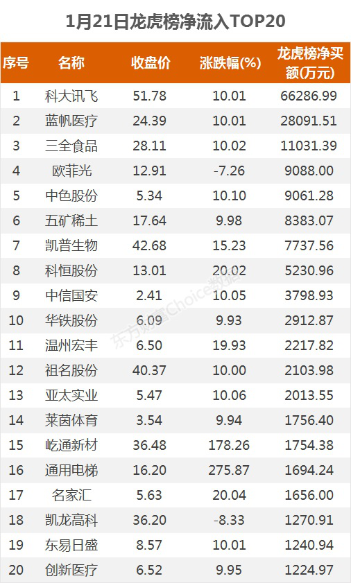 摘要【龙虎榜:6.63亿资金抢筹科大讯飞 机构净买这11股】1月21日,指数全天震荡走高,截至收盘,沪指涨1.07%,报收3621点;深成指涨1.95%,报收15520点;创业板指涨2.46%,报收3283点。盘面上,稀土、煤炭、基因测序等板块涨幅居前,物业管理、注册制次新、造纸等板块跌幅居前。