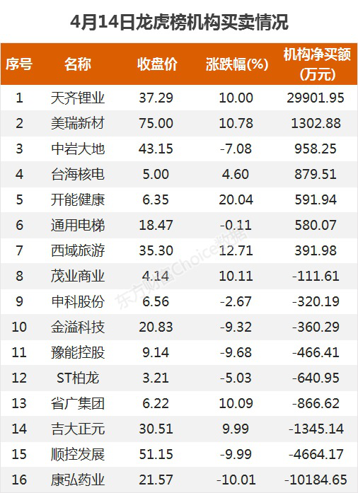 14日北向资金净买入57.31亿元 连续三日净流入数据显示,今日,北向资金早盘大幅净流入,一度净买入超74亿元,午后略有回流,全天净买入57.31亿元,为连续3日净买入;其中沪股通净买入15.41亿元,深股通净买入41.91亿元。歌尔股份等33股获北向资金增持额超亿元统计显示,4月13日共有743只股获北向资金持股量环比上一个交易日增加,以增持的股份数量和当日收盘价为基准进行测算,加仓股中,增持市值在亿元以上的有33只,增持市值最多的是歌尔股份,最新持股量为2.7亿股,环比增加8%,增持市值为5.94亿元;其次是中国中免、宁德时代。北向资金减持榜:30股减持市值超5000万元统计显示,4月13日共有752只股持股量环比上一个交易日减少,以减持的股份数量和当日收盘价为基准进行测算,减持股中,减持市值超千万元的有156只,减持市值在5000万元以上的有30只,减持市值最多的是顺丰控股,最新持股量为1.71亿股,环比减少2.68%,减持市值为3.05亿元,其次是隆基股份、士兰微,减持市值分别为2.60亿元、2.29亿元。龙虎榜:龙虎榜:2.8亿抢筹天齐锂业 外资净买3股 机构净买7股4月14日,上榜龙虎榜个股中,资金净流入最多的是天齐锂业,为2.8亿元。数据显示,该股日内涨停收盘,全天换手率6.24%。机构参与龙虎榜中个股共涉及16只个股,其中7只被机构净买入,天齐锂业被买入最多,为2.99亿元。