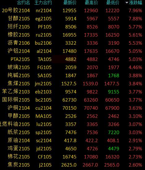 国内商品期货收盘多数收涨 20号胶涨停且创上市以来新高