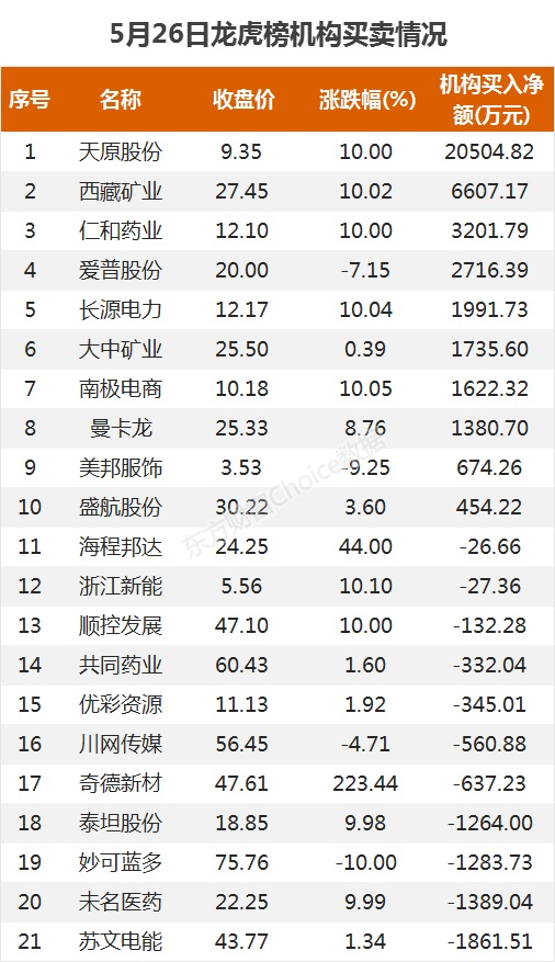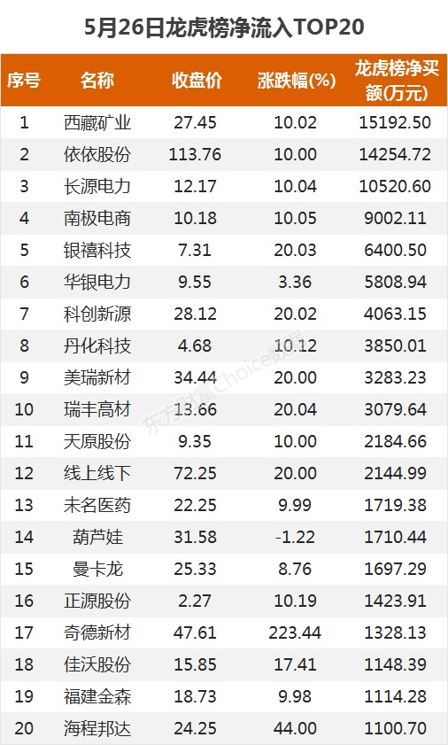 龙虎榜净流入TOP205月26日,上榜龙虎榜个股中,资金净流入最多的是西藏矿业,为1.52亿元。数据显示,该股日内涨停收盘,全天换手率16.64%。具体看,招商深圳深南东路净买入6589.88万元,国泰君安南京太平南路净买入6859.81万元。