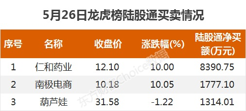数据来源:东方财富Choice数据陆股通买卖情况陆股通参与龙虎榜中个股共涉及3股,均被陆股通净买入,仁和药业被买入最多,为8390.75万元。
