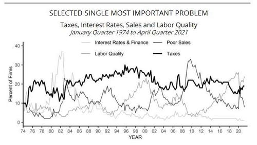 Linked with this, while just 8% cited labor costs as their top business problem, a whopping 24% said that labor quality was their top business problem, unchanged from March and the top overall concern.