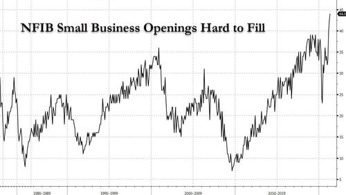 When we looked last month at how "Biden's Trillions" in fiscal stimulus policies have crushed small and medium businesses, where millions of workers would rather stay home and collect extended unemployment benefits, leaving mom and pop companies scrambling to hire workers or otherwise hike wages squeezing already razor thin margins (to the benefit of mega corporations which can be comfortably cash flow negative thanks to their access to capital markets, putting America's vibrant SMEs out of business), we pointed to the just released NFIB Small Business survey which found that a record 42% of respondents said they have job openings that could not be filled.