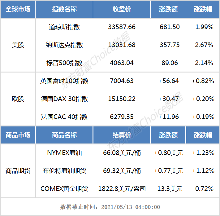 商品市场:国际金价跌超0.7%,收于每盎司1822.8美元。截止收盘,纽约商品交易所黄金期货市场交投最活跃的6月黄金期价12日比前一交易日下跌13.3美元,收于每盎司1822.8美元,跌幅为0.72%。国际油价收涨,美油、布油均涨超1%。截止收盘,纽约6月原油期货收涨0.80美元,涨幅1.23%,报66.08美元/桶。布伦特7月原油期货收涨0.77美元,涨幅1.12%,报69.32美元/桶。