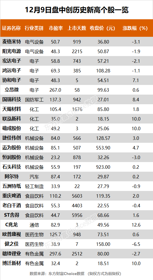 摘要【创业板指跌近2% 阳光电源、天赐材料等24股创历史新高】12月9日,沪指收报3371.96点,跌1.12%。东方财富Choice数据显示,今日有24只个股盘中股价创历史新高。其中,个股包括阳光电源、天赐材料等。