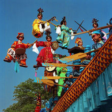 八音是广泛流行于中国南方的古老乐种之一,属民间音乐。因使用8 类乐器而得名,即:弦(二胡)、琴(月琴、扬琴、三弦)、笛(唢呐、嘀嗒)、管(长、短喉管)、箫(横箫、直箫、洞箫)、锣、鼓、钹等. 演出时由两人也有多人抬着一架彩绸、花串、球穗、图案等装饰的锣鼓亭,按打击乐、管弦乐的顺序,边行边演奏,曲调高昂洪亮,演奏时周而复始,旋律欢快,气氛热烈而流畅。其乐曲因场合不同而异。游神时它一般跟在神的后面,它那"咚咚"声源远远便可入耳,很多人根据锣鼓声的大小来判断是否到自家摆醮的时候了。