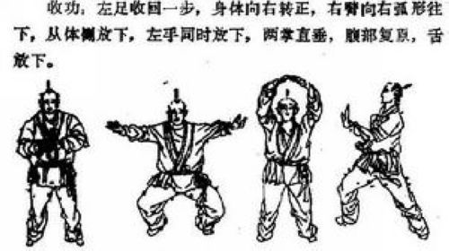 两脚左右自然开立,与肩同宽,脚尖朝向正前方,膝部挺直。双手自然垂臂于身体两侧,双肩放松,手心朝里,手背向外。双目上下轻闭,舌尖抵住上腭,全身放松。神态安详,排除一切杂念,集中思想,呼吸自然,意守丹田半分钟。