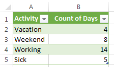 Source = Excel.CurrentWorkbook(){[Name="Calendar"]}[Content],GroupedRows = Table.Group(Source, {"Activity"},{{"Count of Days", each Table.RowCount(_), type number}})in