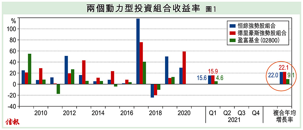 截至3月31日止,「恒綜組合」和「德里豪斯組合」於過去3個月回報率分別為15.6%和15.9%,較同期盈富基金的4.6%【圖1】,高出超過10個百分點。