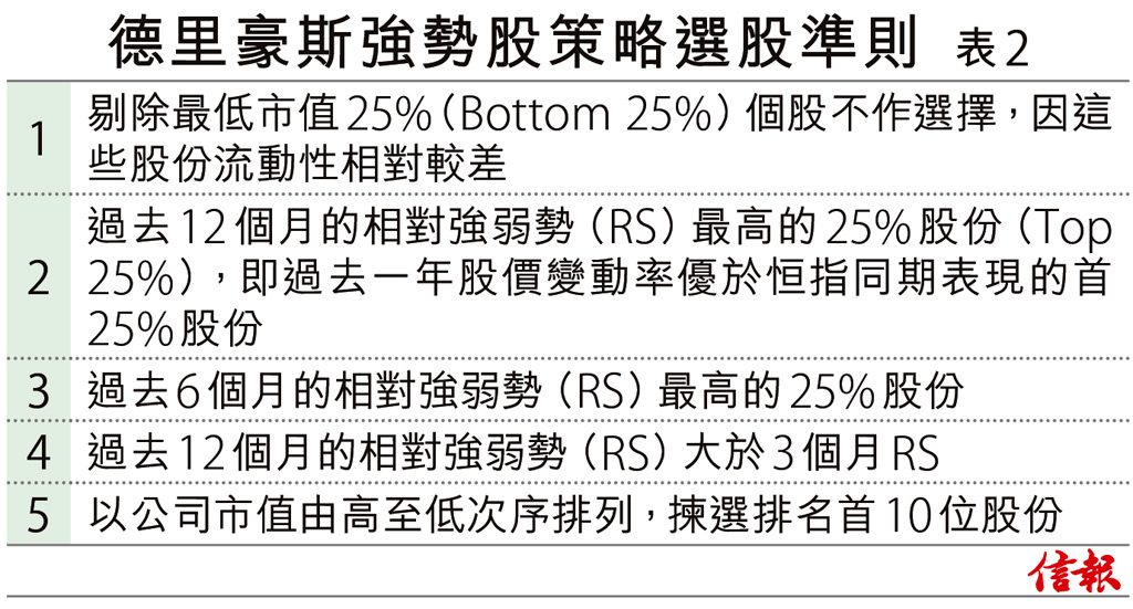 筆者多年前編製了上述兩個動力型的模擬投資組合,且一直跟進其表現,發現投資成績十分突出,更遠遠跑贏同期盈富基金(02800)。過去一個季度情況又如何呢?筆者先簡單重溫何謂動力型投資法,以及「恒綜組合」和「德里豪斯組合」操作細節,繼而檢測今年第一季這兩個組合的表現。