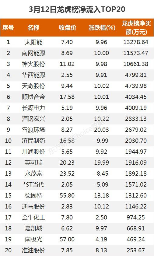 龙虎榜净流入TOP203月12日,上榜龙虎榜个股中,资金净流入最多的是太阳能,为1.3亿元。数据显示,该股日内涨停收盘,全天换手率17.13%。具体看,国元证券上海中山北路净买入5471.06万元。