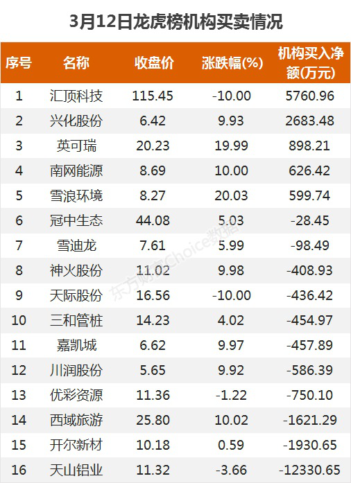 数据来源:东方财富Choice数据机构买卖情况机构参与龙虎榜中个股共涉及16股,其中5股被机构净买入,汇顶科技被买入最多,为5760.96万元。另外11股被机构净卖出,天山铝业被卖出最多,为1.2亿元。